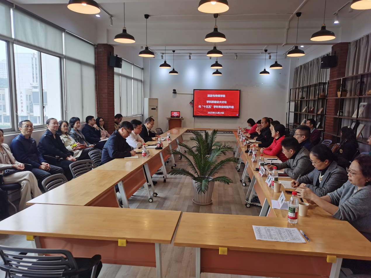 2025年11月14日下午,旅游与传媒学院积极响应学校号召,组织了一场关于学科群建设的大讨论活动,并同步开展了针对“十五五”期间学科专业转型升级的指导会议。此次活动旨在科学谋划学院未来发展蓝图,推动学科专业转型升级,为形成目标清晰、路径科学、举措有力的学科群建设方案奠定坚实基础。