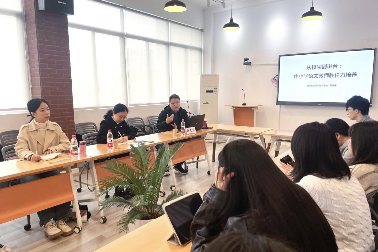 2025年11月6日上午,国际中文教育专业“卓越教师培养计划”第五期讲座在第一教学楼如期举行。本次讲座特邀西南大学附属中学高中语文教研室主任、西南大学硕士研究生指导教师、北碚图书馆“缙云文化大讲堂”特聘教师苟晓东老师担任主讲。讲座由国际中文教育专业学科带头人蒋霞教授主持,2025级国际中文教育专业的硕士研究生均到场聆听。