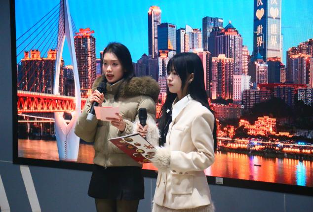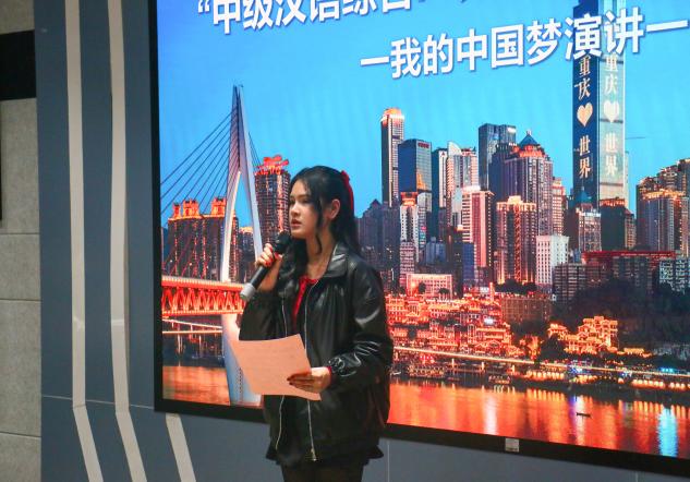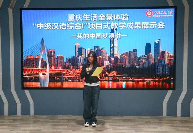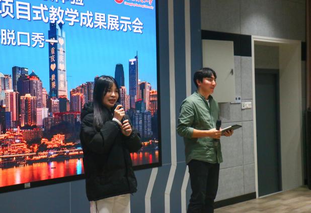 展示过程中,精彩环节接连上演:跨文化差异主题脱口秀笑点密集,引得现场师生阵阵欢笑;同学们精心录制的生活vlog生动鲜活,既展现了日常学习生活的点滴,也记录了丰富多彩的课外活动瞬间;趣味十足的“方言猜猜猜”游戏更是将现场气氛推向高潮,师生踊跃参与互动,同学们在轻松欢乐的氛围中学习方言知识、感受重庆文化魅力,面对老师们抛出的方言难题,大家沉着应对、一一破解,尽显师生间亦师亦友的融洽情谊。游戏过后,展示进入核心环节。同学们依次呈现了丰富多样的学习成果:涵盖方言卡片、美食图册、自制美食视频、重庆旅游攻略,以及关于清洁工工作时间与特色建筑的调研报告。更有同学带来题为“我的中国梦”的演讲,深情倾诉了在重庆求学的所见所感与成长收获。