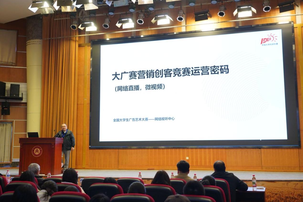 在随后的主旨讲座环节,四位嘉宾轮番登台,从不同维度解构创意的内核与外延。首先开讲的是重庆大学教授、大广赛国奖资深评委袁恩培老师。他回顾了第17届大广赛营销创客单元的参赛高校与获奖数据,指出该赛道获奖概率较高,鼓励同学们积极参与。他还分享了往届优秀作品,并特别提到在人工智能时代,人人都可以成为行业大师,关键在于善用AI工具让作品更具吸引力。他呼吁老师们认真指导、学生们积极参与,多出作品、出好作品。