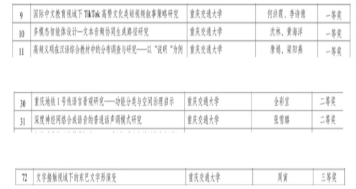 近日,根据《重庆市教育委员会关于举办第四届语言文字论文评选活动的通知》(渝教语函〔2025〕13号)文件精神,经各单位选送、市级专家评审、社会公示等严格程序,重庆市第四届语言文字论文评选活动获奖结果正式揭晓。我校在此次评选中共有5项成果获奖,其中一等奖3项、二等奖2项、三等奖1项,充分展现了我校语言文字工作者的深厚学术功底与创新研究能力。