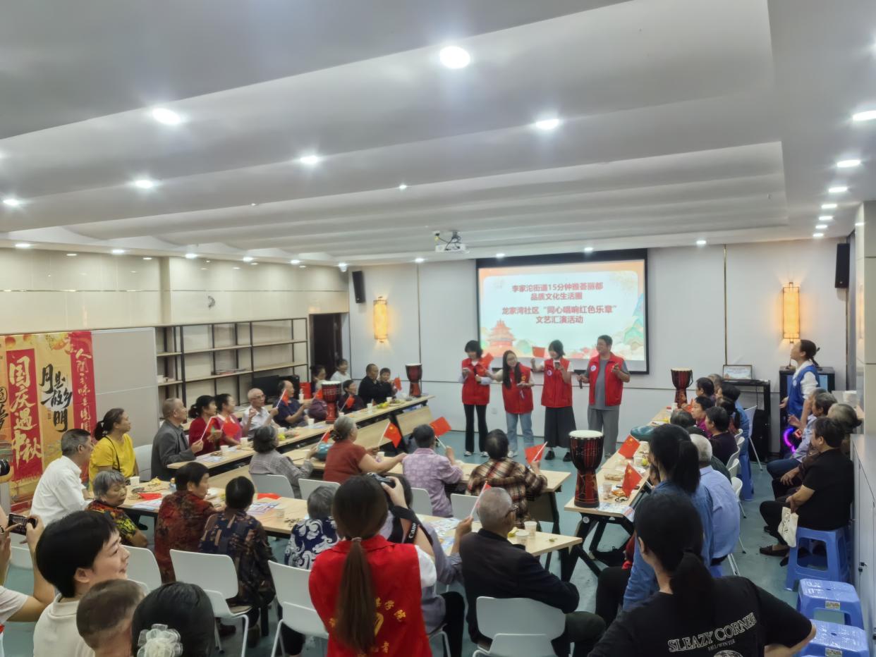 温情在合唱中升华。当《我和我的祖国》《歌唱祖国》旋律奏响,青年党员主动起身,热情邀请老党员与居民。大家的合唱声在室内回荡,鲜艳的国旗在手中挥舞。歌声交融,情感汇聚,共同献上对祖国最深情的祝福。