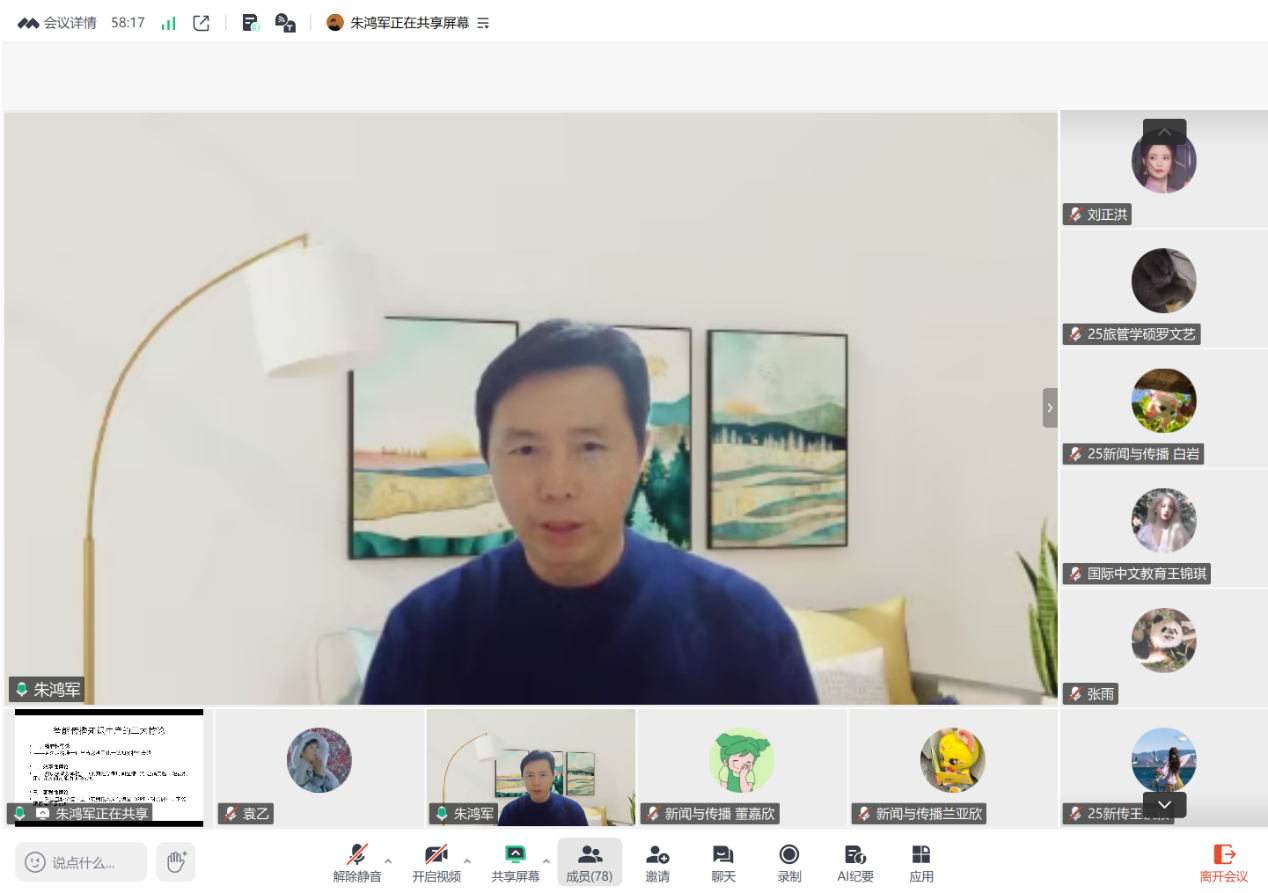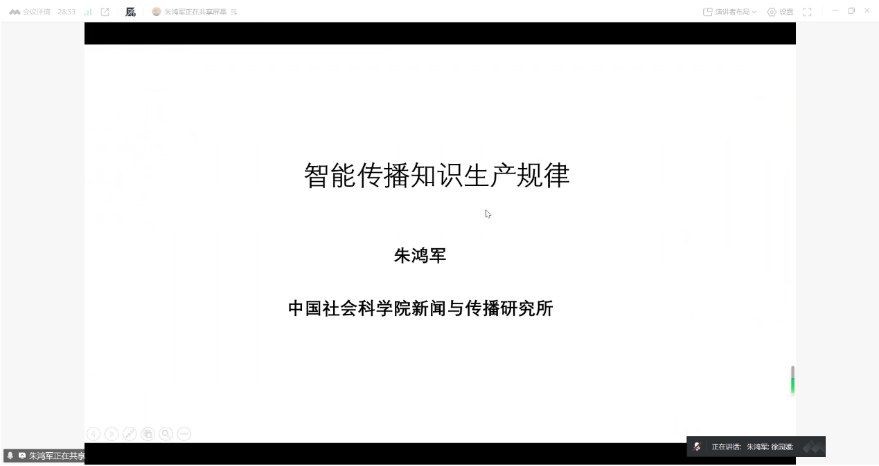 为了强化思想引领,筑牢信仰根基,引导师生在智能技术的洪流中坚守人文精神、维护认知自主。10月22日,旅游与传媒学院党委特邀中国社会科学院大学新闻与传播学院教授、博士生导师,中国社会科学院新闻与传播研究所研究员朱鸿军进行题为“智能传播知识生产规律”的线上专题培训。本次讲座由学院党委书记徐园媛主持,学院研究生全体党员、入党积极分子参会。
