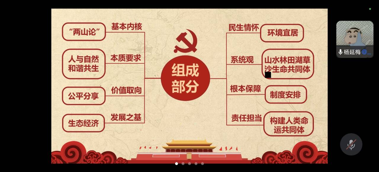 河海学院教师杨延梅首先阐释了生态文明思想的四大来源,随后解析其核心构成,并介绍了以制度保障生态文明建设的实践路径,包括责任体系、考核体系等制度安排,引导入党积极分子深化对生态文明建设的理解与践行意识。