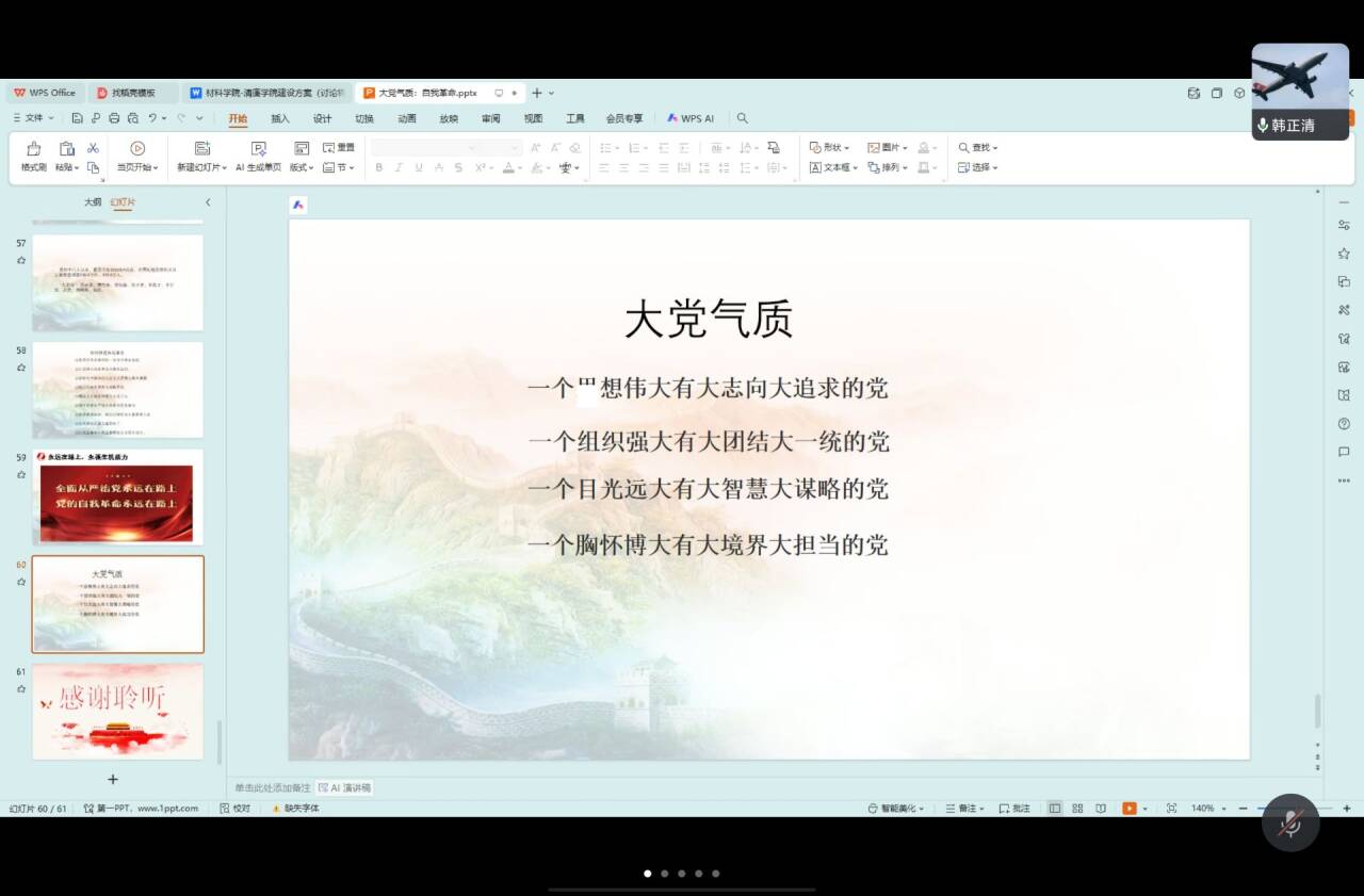 航空学院正处级组织员韩正清从中国共产党面临的五大难题出发,系统地讲述了中国共产党发展的历史,围绕“大党独有难题”展开讲解,重点剖析党在统一思想、执政能力、精神状态以及自我革命方面面临的挑战,强调自我革命与持续学习的重要性,引领入党积极分子找到党永葆生机活力的答案。