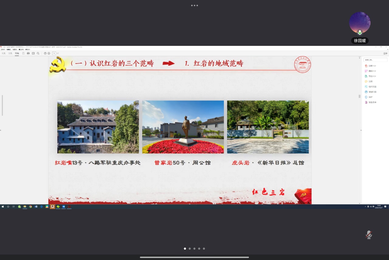 旅游与传媒学院党委书记徐园媛从 “起、承、入、合” 四个维度展开解读红岩精神的内涵,同时介绍 “红色三岩”地域载体,并结合习近平总书记论述,解读了弘扬该精神在坚定理想、厚植爱国情怀等方面的现实启示,助力入党积极分子深化对革命精神的理解与传承。