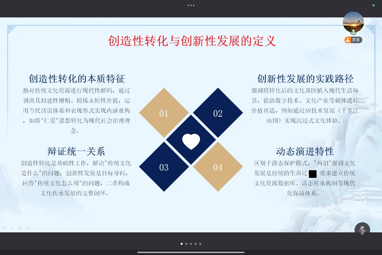 旅游与传媒学院教师周洪洁围绕 “两创”展开,解析其内涵,结合习近平总书记 “第二个结合” 论述,阐明 “两创”“以文化人、以文育德、以文兴邦” 的内核,挖掘传统文化当代价值的路径,为文化传承发展提供思路,助力入党积极分子深化对民族现代文明建设的认知