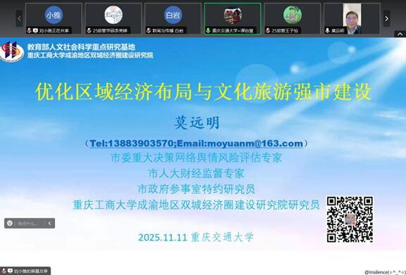 莫远明首先领学了党的二十届四中全会关于区域协调发展的重要论述,并从开展国家战略统筹协调的顶层设计、发挥国家发展规划的战略导向作用、加强国家区域重大战略的协同联动、深化国家重大战略的产业优化布局、推进省域协同创新经济大省挑大梁等方面作了政策解读。他从国家层面、成渝双圈层面、重庆都市圈层面和重庆市域层面,分析了“十五五”时期重庆优化区域经济布局、促进区域协调发展的战略考量。在服务国家战略视野下,他提出了重庆文化旅游强市建设的战略定位、发展目标、发展规划、重要举措与未来展望。最后他针对重庆交大研究生参与文化旅游强市建设,从贯彻落实重要会议精神、参加专题调查研究工作、体验文化旅游消费活动、助力地方经济社会发展等方面提出了创新思路。