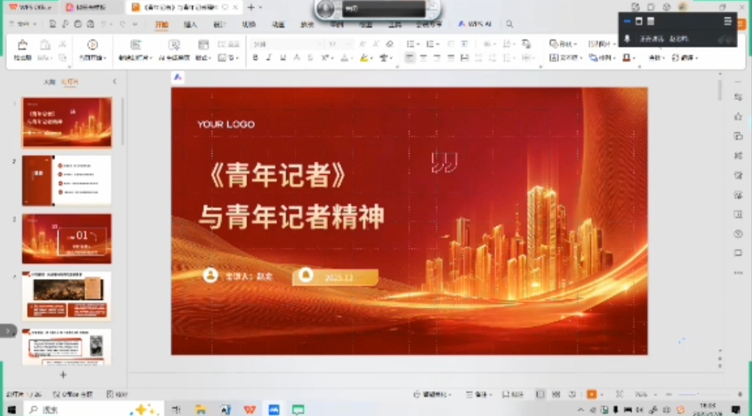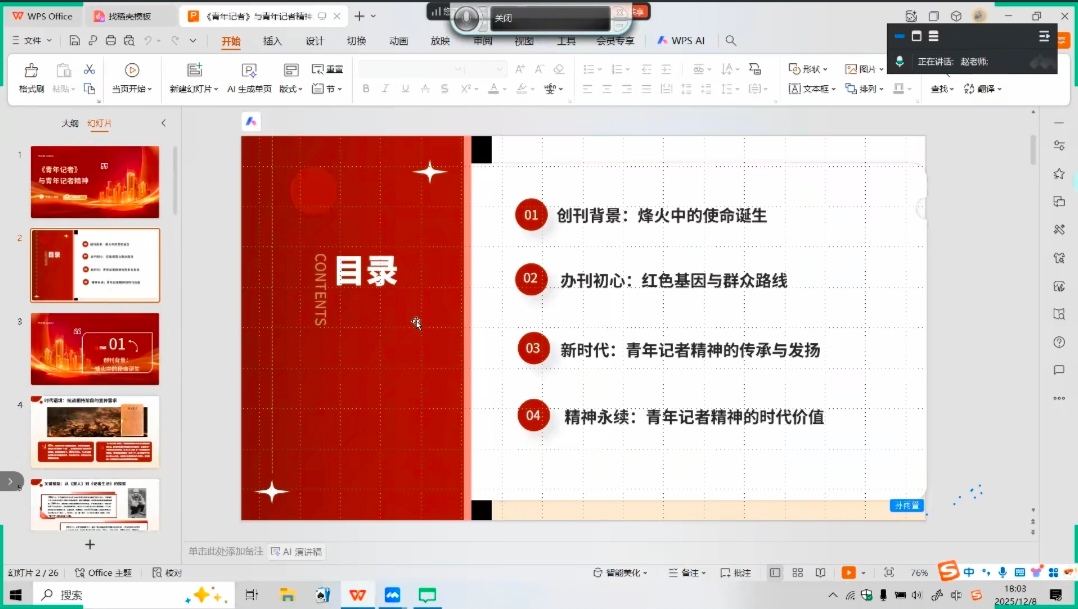 2025年12月8日下午6时,一场以“《青年记者》与青年记者精神”为主题的线上专题讲座成功举行。旅传学院党委邀请资深新闻工作者、《青年记者》杂志副主编赵金老师线上开讲,深入追溯这本拥有八十余年历史的新闻业务刊物的红色根脉,生动诠释了其所承载的宝贵精神。旅传学院全体研究生党员参加。