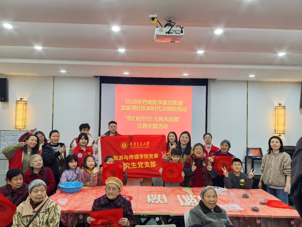 元宵佳节渐近,为弘扬中华优秀传统文化,践行党员服务群众的初心使命,旅游与传媒学院研究生党支部主动与龙家湾社区对接,组织6名党员同志投身社区“我们的节日•元宵庆团圆”主题活动,以党建引领志愿服务,与社区居民共庆团圆佳节,传递温暖关怀。
