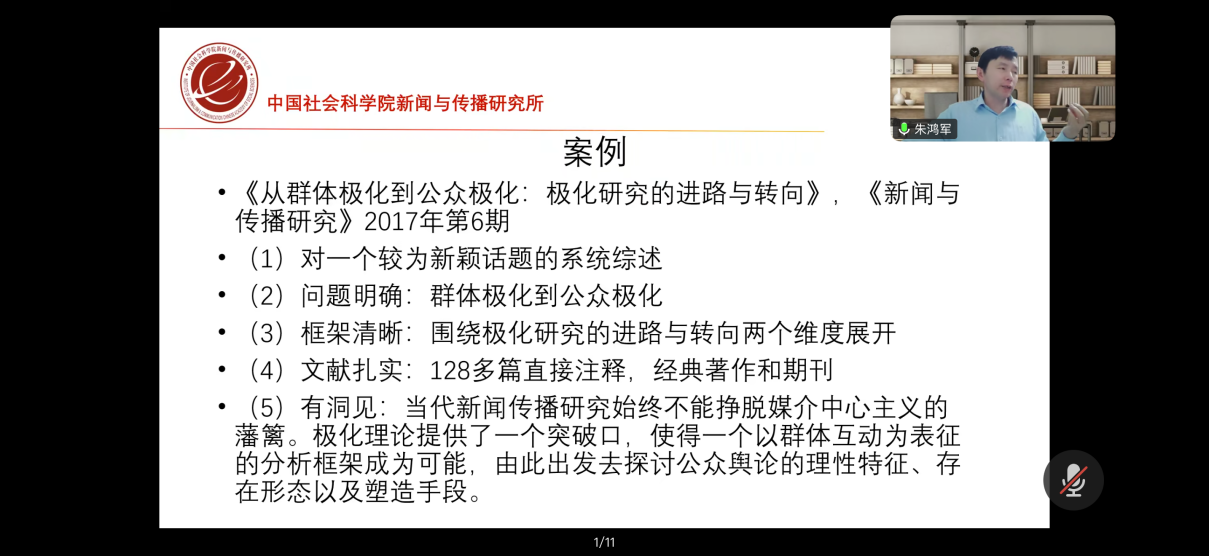 随后,朱鸿军老师结合自身丰富的编审经验,详细讲解了新闻传播学常见的论文类型。并且,在剖析写作痛点时,朱鸿军老师指出了五类突出问题:文体混淆、结构缺失、论证薄弱、逻辑不清、方法不规范。他强调,规范是学术研究的基本底线,也是高质量成果产出的前提。