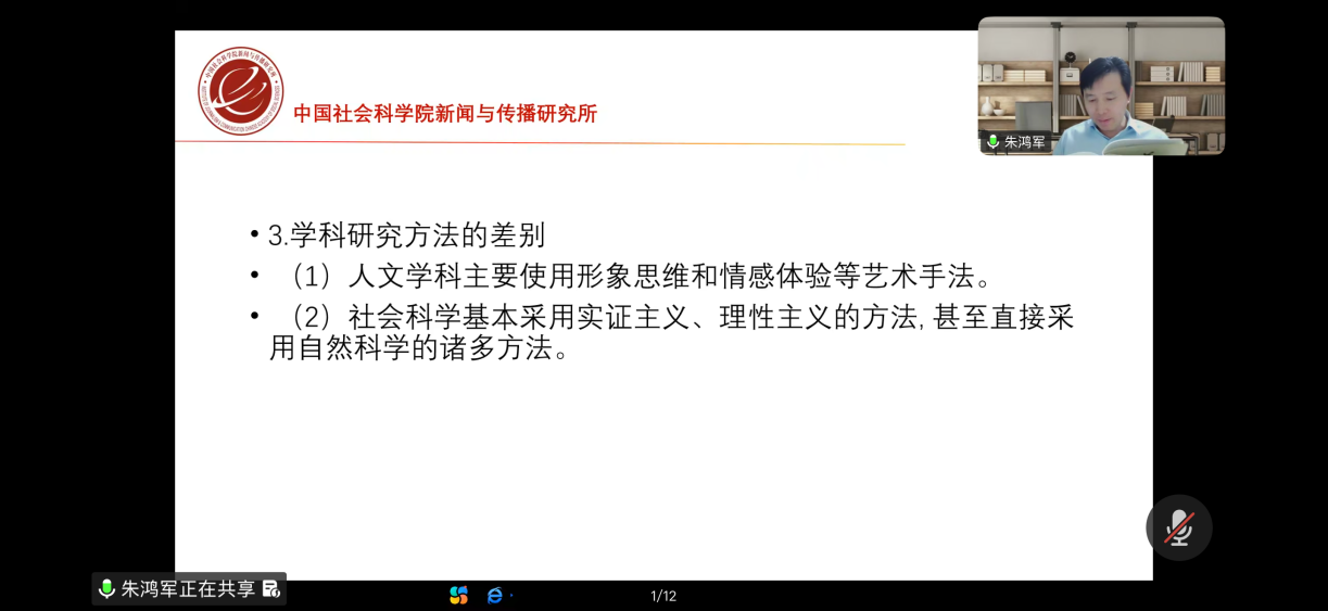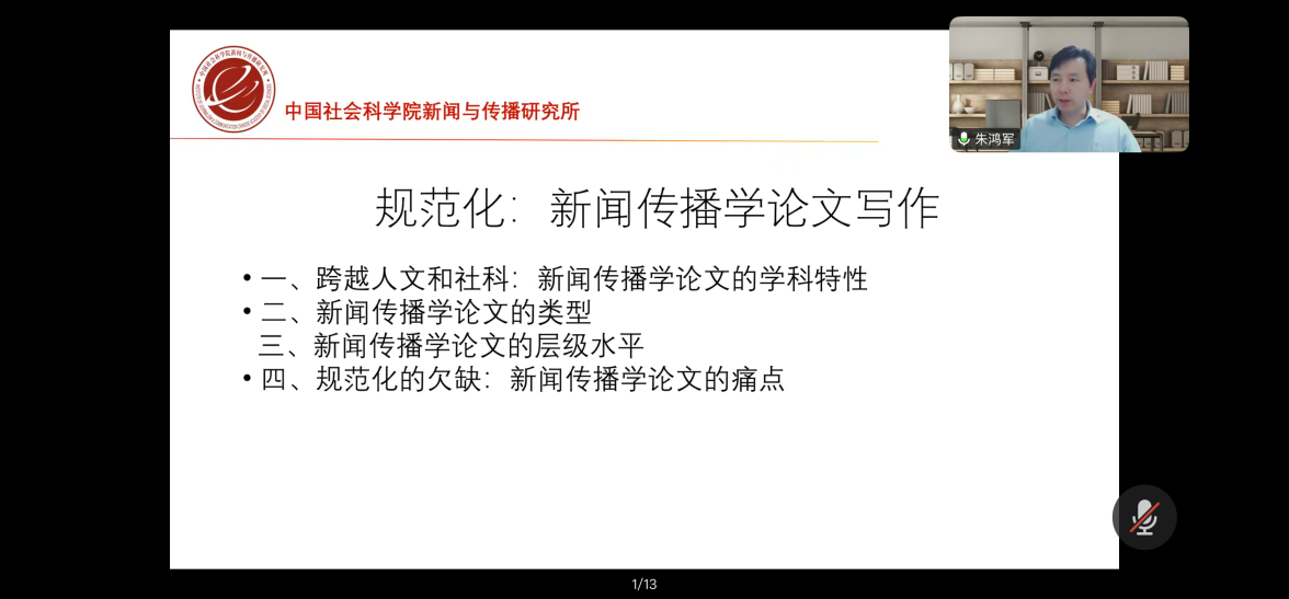 会上,朱鸿军深入阐述了奋斗精神对于学术研究的重要意义,他指出,奋斗精神不仅是推动个人成长的核心动力,更是学术研究得以持续发展的力量源泉。他强调,学术研究是一项需要长期投入和坚持不懈的事业,研究者必须具备锲而不舍的韧劲,只有通过深耕细作、不断积累,才能在严格遵守学术规范的基础上,实现真正意义上的创新与突破。朱鸿军老师还特别提到,作为学生党员,更应当以身作则,发扬奋斗精神,不仅在学术上追求卓越,还要在思想上和行动上起到模范带头作用,将个人的成长与国家的发展紧密结合,为实现中华民族伟大复兴的中国梦贡献青春力量。然后朱鸿军围绕“新闻传播学论文的规范性问题”做了讲解,首先分析了学科特性,指出新闻传播学兼具人文学科与社会科学的双重属性,但总体上更倾向于社会科学。