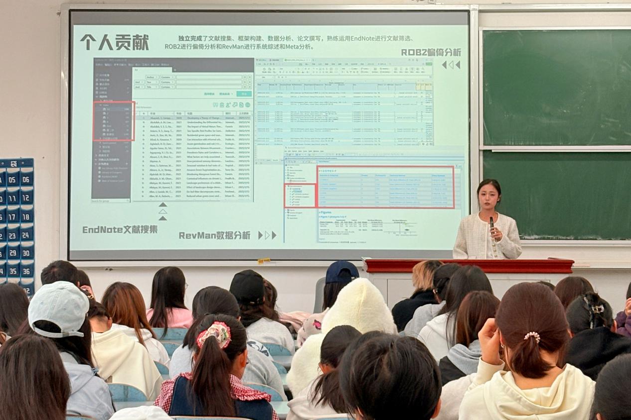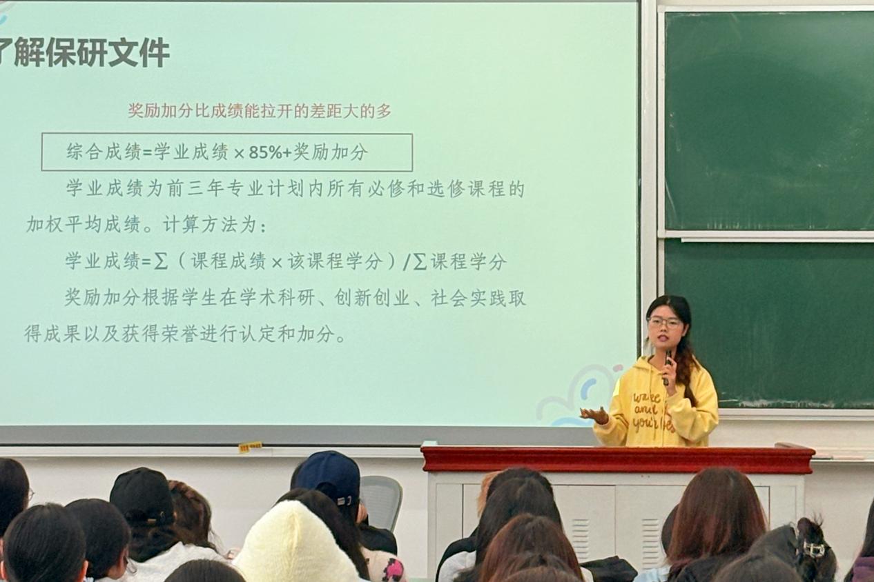 庹海艳首先解析了研究生推免政策,以研究生推免为自身画像,明确学习目标。她提到,最终保研成绩由学业成绩与竞赛奖励加分构成,并鼓励与会低年级学生:“从点滴做起,锻炼自身的同时,丰富履历,大学要兼顾学业与实践经验,学业成绩方面,鼓励大家讲目标设定在专业排名前30%,要讲自己的学习成果、项目经验转换为期刊论文、软件著作专利等项目,实现学习、科研、项目开花结果。