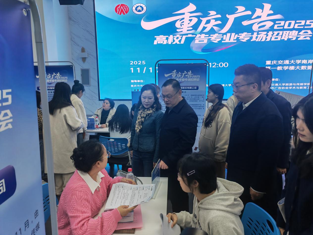 2025年11月17日,重庆广告2025高校广告专业专场招聘会在重庆交通大学第一教学楼大数据中心圆满举行。此次招聘会得到了重庆市市场监督管理局的全程指导,由市广告协会与重庆交通大学联合主办,重庆交通大学旅游与传媒学院及市广告协会学术与教育工作委员会共同承办。活动旨在搭建校企精准对接平台,促进广告人才培养与行业需求的深度融合。重庆市市场监督管理局对此次活动给予了高度重视,市市场监管局广告处处长余红霞、副处长廖佳,南岸区市场监管局局长李健等市区两级市场监管部门代表出席了此次招聘会。学校招生就业处给予大力支持,舒琳处长出席招聘会启动仪式。来自全市的26家广告及相关企业、各大高校广告专业教师代表以及200余名高校应届毕业生积极参与了本次活动。