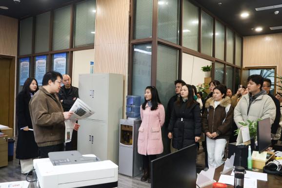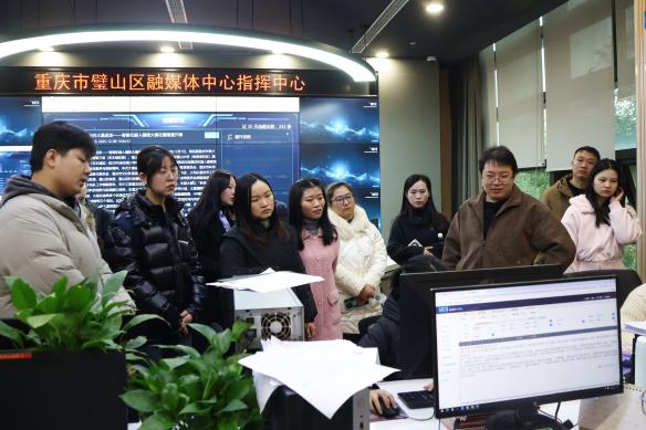 调研期间,璧山区融媒体中心相关负责人带领师生实地探访了璧山报编辑部中央厨房。在现场,工作人员详细讲解了中央厨房系统的功能架构,展示了其如何通过一体化指挥调度,实现新闻线索汇聚、选题策划、采访编辑、多渠道发布的闭环管理。师生们了解到,依托这一系统,融媒体中心不仅筑牢了基层主流舆论阵地,还通过优化采编流程提升了内容生产效率,以综合服务平台和社区信息枢纽的定位,切实增强了融媒体产品的传播力、引导力、影响力与公信力。