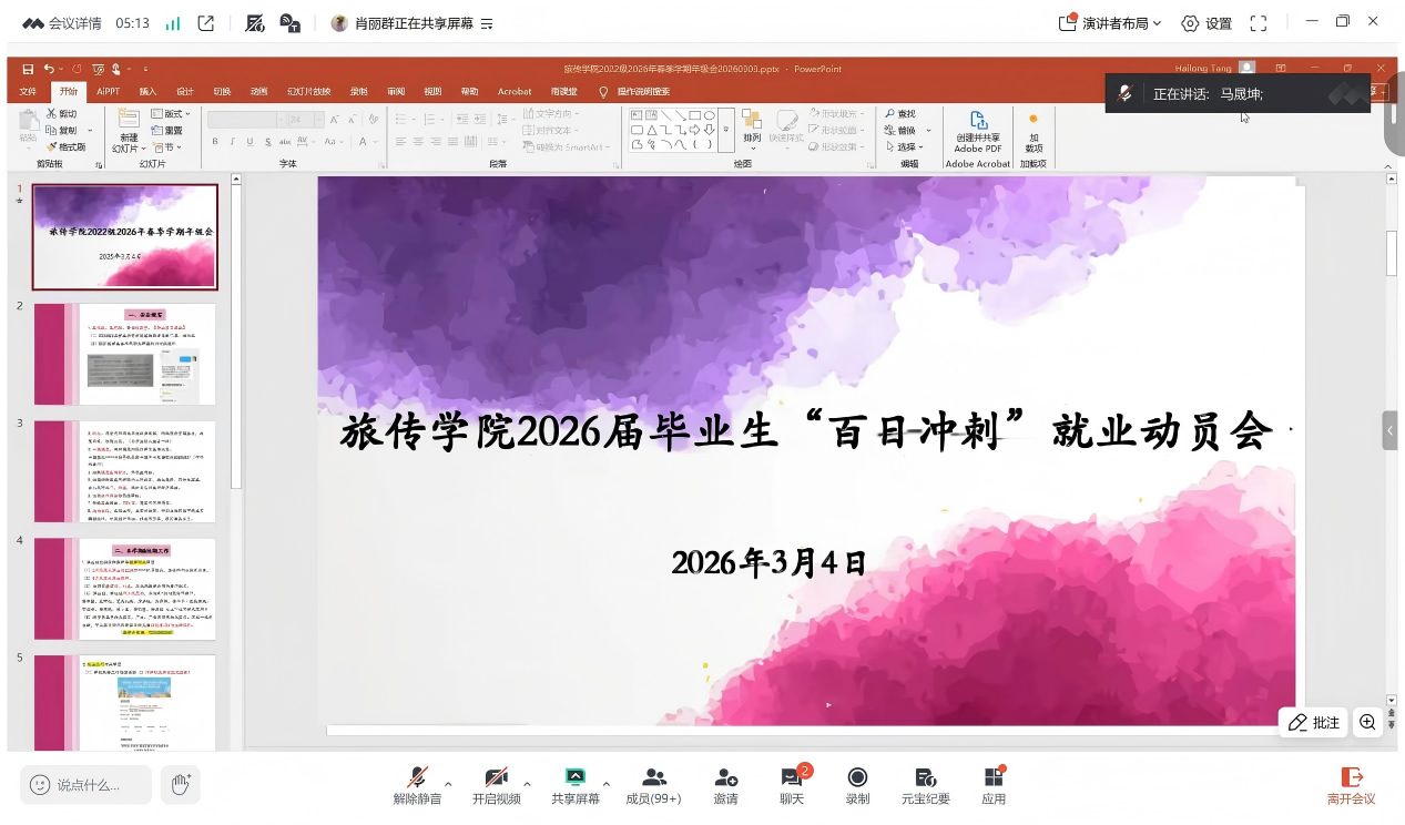 云端聚力促就业,百日冲刺启新程。为切实破解旅传学院2026届毕业生就业难题,抢抓“春招”关键窗口期,进一步引导毕业生树立正确就业观念、明确求职方向、提升就业竞争力,近日,旅游与传媒学院针对全体在外实习的2026届毕业生,召开“百日冲刺”就业动员线上会议。学院党委副书记马晟坤、毕业班辅导员、帮扶指导老师及全体2026届毕业生参会。