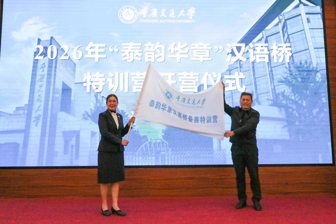3月19日,2026年“泰韵华章”汉语桥特训营开营仪式在我校南岸校区明德楼408会议室举行。泰国教育部基础教育委员会秘书长助理ATITTAYA PUNYA及相关代表,重庆交通大学副校长罗均,旅游与传媒学院、国际合作交流处、国际教育学院等相关职能部门及学院负责人,旅游与传媒学院汉语文化系师生及特训营全体营员参加仪式。仪式由旅游与传媒学院院长张玉蓉主持,罗均副校长宣布特训营开营并授营旗。